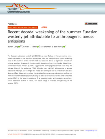 Recent decadal weakening of the summer Eurasian westerly jet attributable to anthropogenic aerosol emissions.