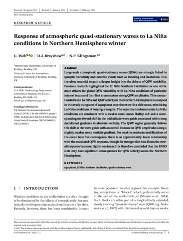 Response of atmospheric quasi-stationary waves to La Niña conditions in Northern Hemisphere winter.