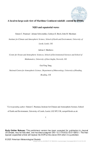 Peatman, S. C., Schwendike, J., Birch, C. E., Marsham, J. H., Matthews, A. J. and Yang, G.-Y. orcid id iconORCID: https://orcid.org/0000-0001-7450-3477 (2021) A local-to-large scale view of Maritime Continent rainfall: control by ENSO, MJO, and equatorial waves. Journal of Climate, 34 (22). pp. 8933-8953. ISSN 1520-0442 doi: 10.1175/JCLI-D-21-0263.1