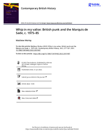 British punk emerged in tandem with the formation of Sex Pistols, a band framed by a style and an aesthetic constructed, in part, by Malcolm McLaren and Vivienne Westwood via their London shop SEX (1974–76). The shop displayed fetishwear and accoutrements designed to fuse youth and sexual subcultures, deploying sex as a cultural weapon to provoke and confront. This article examines the Sadean influences that found expression through punk, suggesting that the Marquis de Sade had a seminal if diffused impact on the punk-informed cultures that evolved through the 1970s into the 1980s. Though often indirect – and bound to broader interpretations of sexual behaviour – the actions, aesthetics and ideas associated with the ‘Divine Marquis’ seemingly tallied with the mood of a country caught in a period of socio-economic and political change.