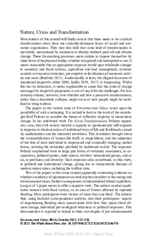 Bardsley, N. (2021) Nature, crisis and transformation. Environmental Values, 5. pp. 533-538. doi: 10.3197/096327121X16245253346576