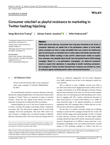 Abstract: While both brand advocacy and protest have long been theorised as key facets in consumers' behaviour, we submit that in the participatory culture of social media, where consumers are free to create and publish their own content, the mischievous play has also become an inevitable form of online culture that brands must deal with. Drawing from Caillois' sociology of play and the cultural power model, we explore how consumers may playfully hijack brands' User‐Generated‐Content (UGC) hashtag campaigns. Based on a non‐participatory netnography, we observed consumers' tweets to unpack their playfulness in responding to brands' marketing communication messages on Twitter and then theorised how consumers use mischief as a form of resistance against marketing practice rather than brands themselves.