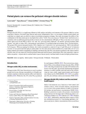 Gubb, C., Blanusa, T., Griffiths, A. and Pfrang, C. (2022) Potted plants can remove the pollutant nitrogen dioxide indoors. Air Quality, Atmosphere & Health, 15. pp. 479-490. ISSN 1873-9318 doi: 10.1007/s11869-022-01171-6
