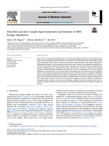 In this study, we build upon internalisation theory in the international business literature and international trade finance in the international economics literature to examine how financial capital affects the decision to export (export propensity) and the share of exports over total sales (export intensity) by the foreign subsidiaries of multinational enterprises. We dissect exports into intra-firm exports (exports to sister affiliates and parent firms) and arm’s length exports (exports to third-party external customers), and we focus on the types of capital that can be used for financing exports, namely intra-firm loans and bank loans. We theorise that these two financing sources have different impacts on subsidiary export behaviour. To test our hypotheses, we use a survey dataset of subsidiaries, hostcountry data, and two-part models. Our findings show that intra-firm loans are positively related to arm’s length export propensity and intensity; however, intra-firm loans have no significant relationship with intra-firm export propensity and export intensity. Additionally, on the one hand, bank loans have a positive impact on the likelihood of subsidiaries becoming arm’s length exporters, but they do not help subsidiaries with arm’s length export intensity. On the other hand, bank loans negatively impact the likelihood of subsidiaries becoming intra-firm exporters; however, once subsidiaries participate in intra-firm exports, bank loans are positively associated with intra-firm export intensity. We discuss the implications of our findings for theory and practice.