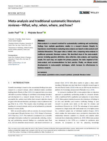 Paul, J. orcid id iconORCID: https://orcid.org/0000-0001-5062-8371 and Barari, M. orcid id iconORCID: https://orcid.org/0000-0002-6905-4897 (2022) Meta‐analysis and traditional systematic literature reviews—What, why, when, where, and how? Psychology & Marketing. ISSN 1520-6793 doi: 10.1002/mar.21657