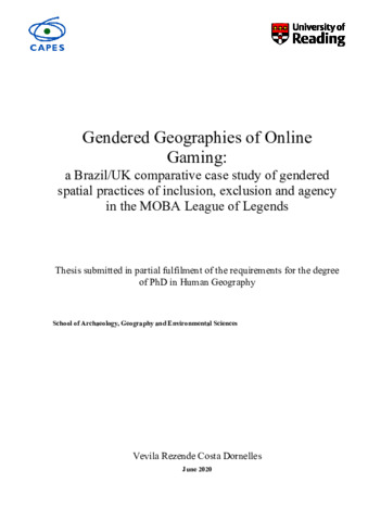 Dornelles, V. R. C. (2020) Gendered geographies of online gaming: a Brazil/UK comparative case study of gendered spatial practices of inclusion, exclusion and agency in the MOBA League of Legends. PhD thesis, University of Reading. doi: 10.48683/1926.00104098