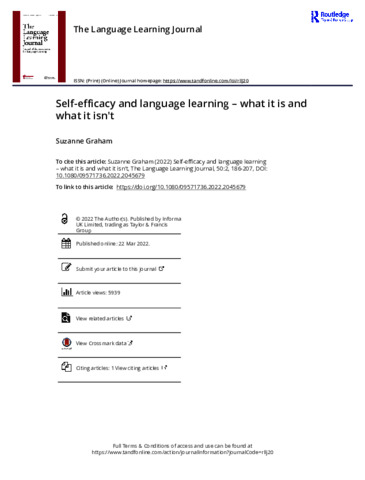 Graham, S. orcid id iconORCID: https://orcid.org/0000-0002-7743-3977 (2022) Self-efficacy and language learning – what it is and what it isn’t. Language Learning Journal, 50 (2). pp. 186-207. ISSN 1753-2167 doi: 10.1080/09571736.2022.2045679