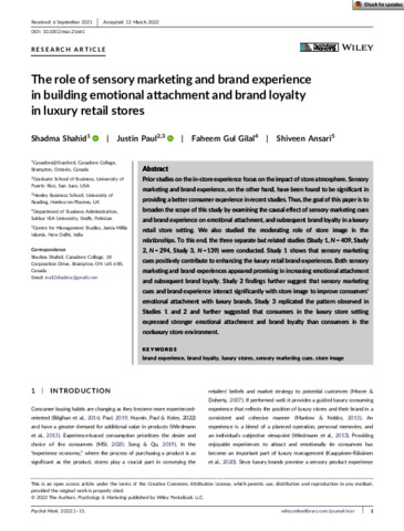 Shahid, S., Paul, J., Gul Gilal, F. and Ansari, S. (2022) The role of sensory marketing and brand experience in building emotional attachment and brand loyalty in luxury retail stores. Psychology & Marketing, 39 (7). ISSN 1520-6793 doi: 10.1002/mar.21661