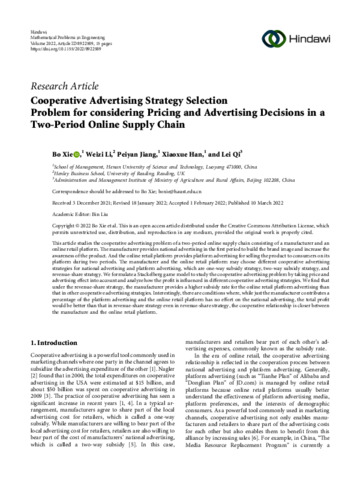Xie, B. orcid id iconORCID: https://orcid.org/0000-0002-9076-3874, Li, W. (V.) orcid id iconORCID: https://orcid.org/0000-0003-2878-3185, Jiang, P., Han, X. and Qi, L. (2022) Cooperative advertising strategy selection problem for considering pricing and advertising decisions in a two-period online supply chain. Mathematical Problems in Engineering, 2022. pp. 1-15. ISSN 1024-123X doi: 10.1155/2022/8922589