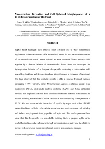 Nanostructure formation and cell spheroid morphogenesis of a peptide supramolecular hydrogel.