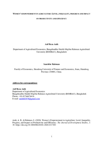 Women’s empowerment in agriculture: level, inequality, progress, and impact on productivity and efficiency.