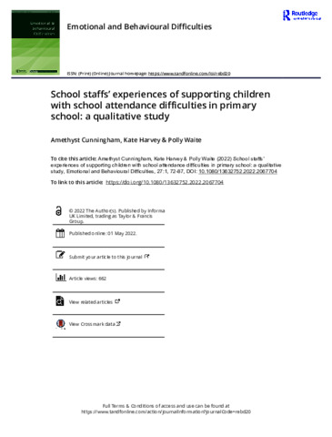 Cunningham, A., Harvey, K. orcid id iconORCID: https://orcid.org/0000-0002-6819-0934 and Waite, P. orcid id iconORCID: https://orcid.org/0000-0002-1967-8028 (2022) School staffs’ experiences of supporting children with school attendance difficulties in primary school: a qualitative study. Emotional and Behavioural Difficulties, 27 (1). pp. 72-87. ISSN 1363-2752 doi: 10.1080/13632752.2022.2067704