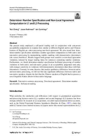 Determiner-number specification and non-local agreement computation in L1 and L2 processing.