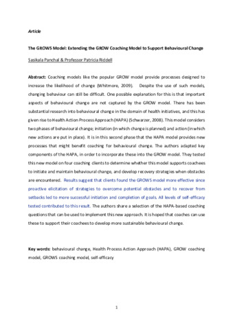 Coaching models like the popular GROW model provide processes designed to increase the likelihood of change (Whitmore, 2009). Despite the use of such models, changing behaviour can still be difficult. One possible explanation for this is that important aspects of behavioural change are not captured by the GROW model. There has been substantial research into behavioural change in the domain of health initiatives, and this has given rise to Health Action Process Approach (HAPA) (Schwarzer, 2008). This model considers two phases of behavioural change; initiation (in which change is planned) and action (in which new actions are put in place). It is in this second phase that the HAPA model provides new processes that might benefit coaching for behavioural change. The authors adapted key components of the HAPA, in order to incorporate these into the GROW model. They tested this new model on four coaching clients to determine whether this model supports coachees to initiate and maintain behavioural change, and develop recovery strategies when obstacles are encountered. Results suggest that clients found the GROWS model more effective since proactive elicitation of strategies to overcome potential obstacles and recovery from setbacks led to more successful initiation and completion of goals. All levels of self-efficacy tested contributed to this result. The authors share a selection of the HAPA-based coaching questions that can be used to implement this new approach. It is hoped that coaches can use these to support their coachees to develop more sustainable behavioural change.