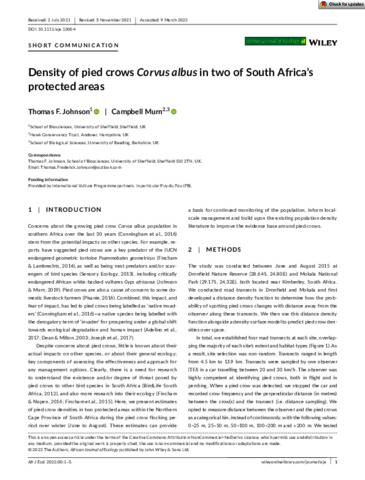 As their numbers increase, concerns exist about the possible negative impact of Pied Crows on other species and crows have been labelled a 'native invader'. However, little is known about the impact of crows on other species and few data exist describing the abundance of crows in the landscape, or how this abundance might change. Here we present some of the first estimates of Pied Crows in two protected areas in South Africa.