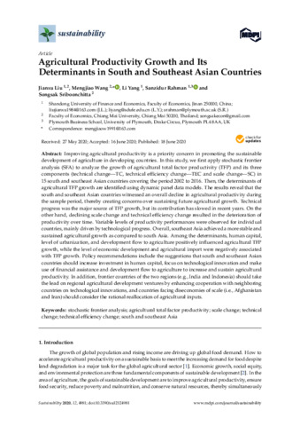 Liu, J., Wang, M. orcid id iconORCID: https://orcid.org/0000-0002-5378-0798, Yang, L., Rahman, S. orcid id iconORCID: https://orcid.org/0000-0002-0391-6191 and Sriboonchitta, S. (2020) Agricultural productivity growth and its determinants in south and southeast Asian countries. Sustainability, 12 (12). 4981. ISSN 2071-1050 doi: 10.3390/su12124981