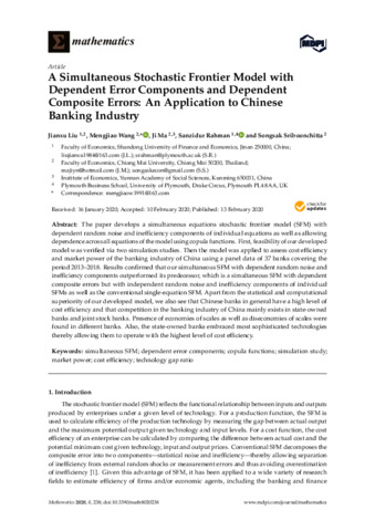 Liu, J., Wang, M. orcid id iconORCID: https://orcid.org/0000-0002-5378-0798, Ma, J., Rahman, S. orcid id iconORCID: https://orcid.org/0000-0002-0391-6191 and Sriboonchitta, S. (2020) A simultaneous stochastic frontier model with dependent error components and dependent composite errors: an application to Chinese banking industry. Mathematics, 8 (2). 238. ISSN 2227-7390 doi: 10.3390/math8020238