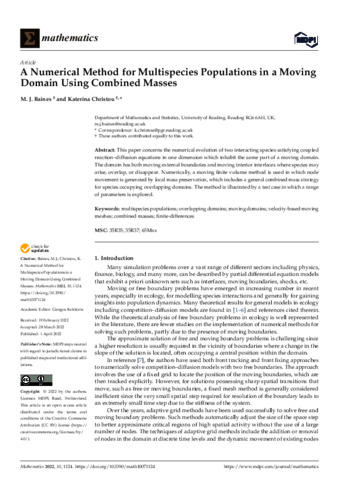Baines, M. J. and Christou, K. (2022) A numerical method for multispecies populations in a moving domain using combined masses. Mathematics, 10 (7). e1124. ISSN 2227-7390 doi: 10.3390/math10071124