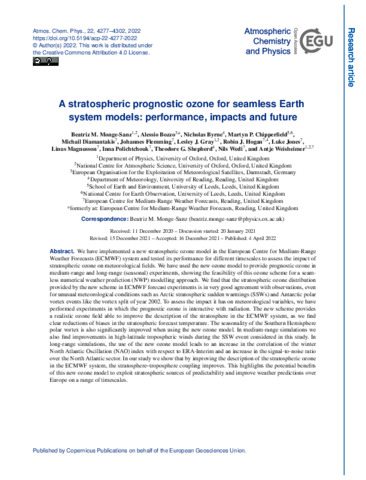 Monge-Sanz, B. M., Bozzo, A., Byrne, N., Chipperfield, M. P., Diamantakis, M., Flemming, J., Gray, L. J., Hogan, R. J. orcid id iconORCID: https://orcid.org/0000-0002-3180-5157, Jones, L., Magnusson, L., Polichtchouk, I., Shepherd, T. G. orcid id iconORCID: https://orcid.org/0000-0002-6631-9968, Wedi, N. and Weisheimer, A. (2022) A stratospheric prognostic ozone for seamless Earth system models: performance, impacts and future. Atmospheric Chemistry and Physics, 22. pp. 4277-4302. ISSN 1680-7316 doi: 10.5194/acp-22-4277-2022
