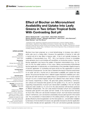 Effect of biochar on micronutrient availability and uptake into leafy greens in two urban tropical soils with contrasting soil pH.