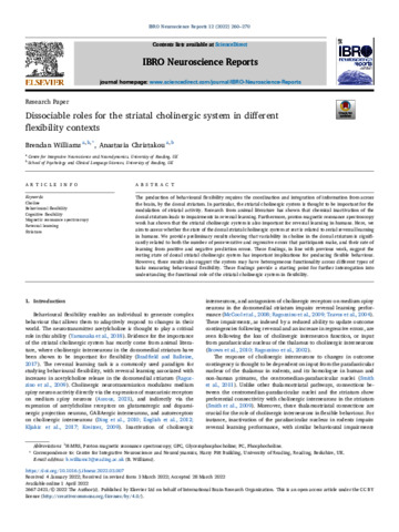 Williams, B. orcid id iconORCID: https://orcid.org/0000-0003-3844-3117 and Christakou, A. orcid id iconORCID: https://orcid.org/0000-0002-4267-3436 (2022) Dissociable roles for the striatal cholinergic system in different flexibility contexts. IBRO Neuroscience Reports, 12. pp. 260-270. ISSN 2667-2421 doi: 10.1016/j.ibneur.2022.03.007