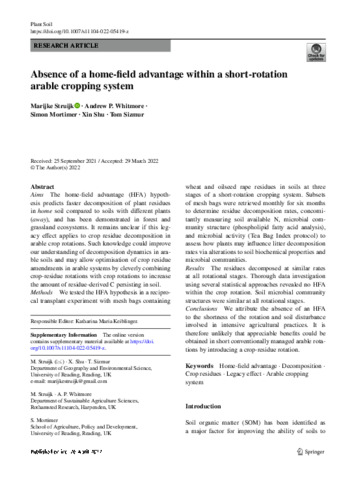 Aims: The home-field advantage (HFA) hypothesis predicts faster decomposition of plant residues in home soil compared to soils with different plants (away), and has been demonstrated in forest and grassland ecosystems. It remains unclear if this legacy effect applies to crop residue decomposition in arable crop rotations. Such knowledge could improve our understanding of decomposition dynamics in arable soils and may allow optimisation of crop residue amendments in arable systems by cleverly combining crop-residue rotations with crop rotations to increasing the amount of residue-derived C persisting in soil. Methods: We tested the HFA hypothesis in a reciprocal transplant experiment with mesh bags containing wheat and oilseed rape residues in soils at three stages of a short-rotation cropping system. Subsets of mesh bags were retrieved monthly for six months to determine residue decomposition rates, concomitantly measuring soil avai¬lable N, microbial community structure (phospholipid fatty acid analysis), and microbial activity (Tea Bag Index protocol) to assess how plants may influence litter decomposition rates via alterations to soil biochemical properties and microbial communities. Results: The residues decomposed at similar rates at all rotational stages. Thorough data investigation using several statistical approaches revealed no HFA within the crop rotation. Soil microbial community structures were similar at all rotational stages. Conclusions: We attribute the absence of an HFA to the shortness of the rotation and soil disturbance involved in intensive agricultural practices. It is therefore unlikely that appreciable benefits could be obtained in short conventionally managed arable rotations by introducing a crop-residue rotation.