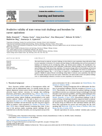 Krannich, M., Goetz, T., Roos, A.-L., Murayama, K., Keller, M. M., Bieg, M. and Lipnevich, A. A. (2022) Predictive validity of state versus trait challenge and boredom for career aspirations. Learning and Instruction, 81. 101596. ISSN 0959-4752 doi: 10.1016/j.learninstruc.2022.101596