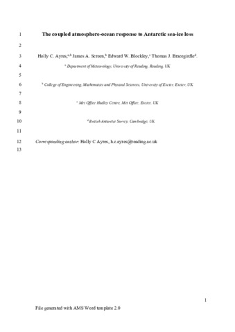 Ayres, H. C. orcid id iconORCID: https://orcid.org/0000-0003-0294-7620, Screen, J. A., Blockley, E. W. and Bracegirdle, T. J. (2022) The coupled atmosphere-ocean response to Antarctic sea-ice loss. Journal of Climate, 35 (14). pp. 4665-4685. ISSN 1520-0442 doi: 10.1175/JCLI-D-21-0918.1
