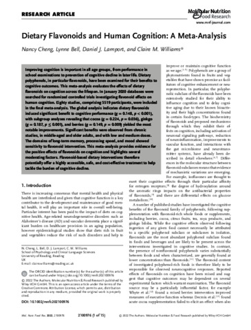 Abstract: Improving cognition is important in all age groups, from performance in school examinations to prevention of cognitive decline in later life. Dietary polyphenols, in particular flavonoids, have been examined for their benefits to cognitive outcomes. This meta‐analysis evaluates the effects of dietary flavonoids on cognition across the lifespan. In January 2020 databases were searched for randomized controlled trials investigating flavonoid effects on human cognition. Eighty studies, comprising 5519 participants, were included in the final meta‐analysis. The global analysis indicates dietary flavonoids induced significant benefit to cognitive performance (g = 0.148, p < 0.001), with subgroup analyses revealing that cocoa (g = 0.224, p = 0.036), ginkgo (g = 0.187, p ≤ 0.001), and berries (g = 0.149, p = 0.009) yielded the most notable improvements. Significant benefits were observed from chronic studies, in middle‐aged and older adults, and with low and medium doses. The domains of long‐term memory, processing speed, and mood showed sensitivity to flavonoid intervention. This meta‐analysis provides evidence for the positive effects of flavonoids on cognition and highlights several moderating factors. Flavonoid‐based dietary interventions therefore potentially offer a highly accessible, safe, and cost‐effective treatment to help tackle the burden of cognitive decline.