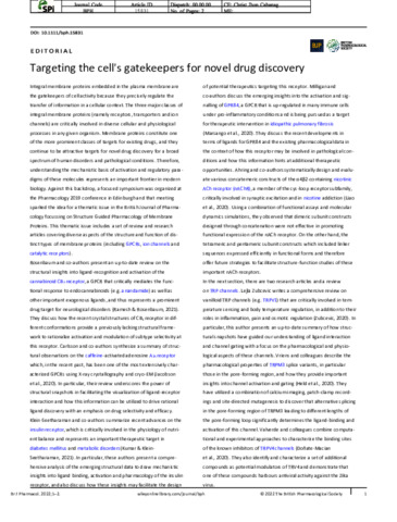 Integral membrane proteins embedded in the plasma membrane are the gatekeepers of cell activity because they precisely regulate the transfer of information in a cellular context. The three major classes of integral membrane proteins (namely receptors, transporters and ion channels) are critically involved in diverse cellular and physiological processes in any given organism. Membrane proteins constitute one of the more prominent classes of targets for existing drugs, and they continue to be attractive targets for novel drug discovery for a broad spectrum of human disorders and pathological conditions. Therefore, understanding the mechanistic basis of activation and regulatory para- digms of these molecules represents an important frontier in modern biology. Against this backdrop, a focused symposium was organized at the Pharmacology 2019 conference in Edinburgh and that meeting sparked the idea for a thematic issue in the British Journal of Pharma- cology focussing on Structure Guided Pharmacology of Membrane Proteins. This thematic issue includes a set of review and research articles covering diverse aspects of the structure and function of distinct types of membrane proteins (including GPCRs, ion channels and catalytic receptors).