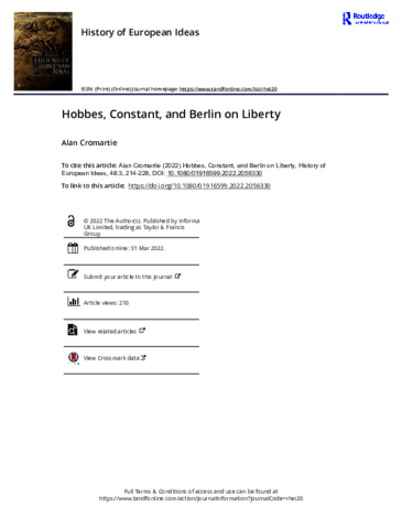Cromartie, A. orcid id iconORCID: https://orcid.org/0009-0009-9558-8081 (2022) Hobbes, Constant, and Berlin on Liberty. History of European Ideas, 48 (3). pp. 214-228. ISSN 0191-6599 doi: 10.1080/01916599.2022.2056330