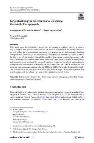 Radko, N. orcid id iconORCID: https://orcid.org/0000-0001-6600-0562, Belitski, M. and Kalyuzhnova, Y. orcid id iconORCID: https://orcid.org/0000-0002-5781-8837 (2023) Conceptualising the entrepreneurial university: the stakeholder approach. The Journal of Technology Transfer, 48. pp. 955-1044. ISSN 0892-9912 doi: 10.1007/s10961-022-09926-0