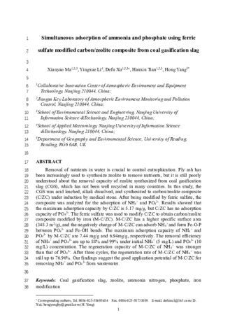 Simultaneous adsorption of ammonia and phosphate using ferric sulfate modified carbon/zeolite composite from coal gasification slag.