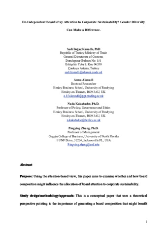 Purpose Using the attention-based view, this paper aims to examine whether and how board composition might influence the allocation of board attention to corporate sustainability. Design/methodology/approach This is a conceptual paper that uses a theoretical perspective pointing to the importance of generating a board composition that might benefit both business case framing and paradoxical framing, a typology introduced in managerial cognition literature to explain managerial decision-making. Findings The conclusions emerging from the reviewed literature suggest that boards that have realized an independence of perspective focus on shareholder profit maximization at the expense of considerations of corporate sustainability. It emerges that women directors who have adopted paradoxical framing can enable boards to consider not only economic but also environmental and social issues of sustainability during board decision-making. Further, it is noted that the effect of gender diversity on allocation of board attention to corporate sustainability is contingent upon contextual (board openness) and structural (chairperson leadership) factors that facilitate social interactions inside boardrooms. Originality/value By considering alternative cognitive frames as well as social interactions, the propositions contribute to a better understanding of the allocation of board attention regarding ambiguous sustainability issues.