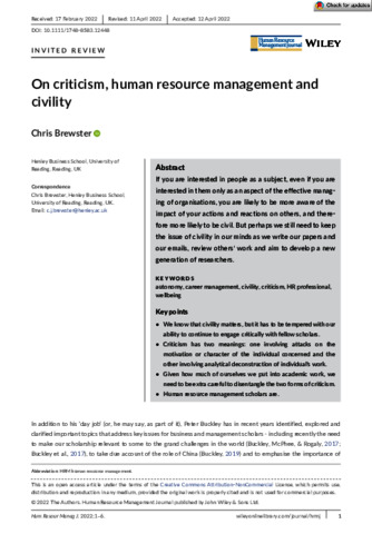 Brewster, C. orcid id iconORCID: https://orcid.org/0000-0001-5314-1518 (2022) On criticism, HRM and civility. Human Resource Management Journal, 32 (3). pp. 518-523. ISSN 1748-8583 doi: 10.1111/1748-8583.12448