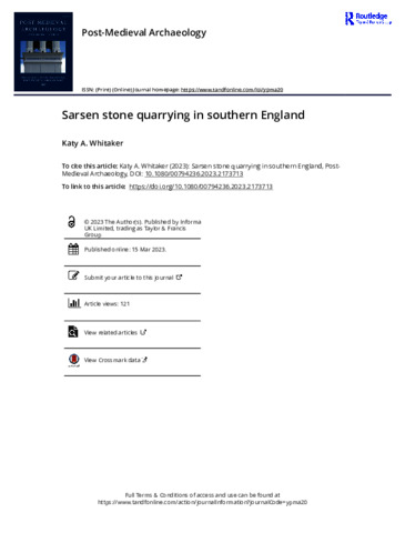 Whitaker, K. A. (2023) Sarsen stone quarrying in Southern England. Post-Medieval Archaeology, 57 (1). pp. 143-176. ISSN 0079-4236 doi: 10.1080/00794236.2023.2173713