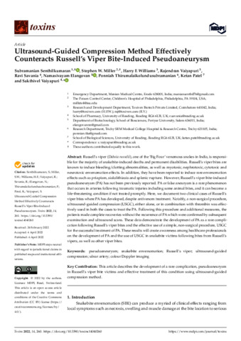Russell’s viper (Daboia russelii), one of the ‘Big Four’ venomous snakes in India is responsible for a majority of snakebite-induced deaths and permanent disabilities. Russell’s viper bites are known to induce bleeding/clotting abnormalities as well as myotoxic, nephrotoxic, cytotoxic and neurotoxic envenomation effects. In addition, they have been reported to induce rare envenomation effects such as priapism, sialolithiasis and splenic rupture. However, Russell’s viper bite-induced pseudoaneurysm (PA) has not been previously reported. PA or false aneurysm is a rare phenomenon that occurs in arteries following traumatic injuries includ-ing some animal bites, and it can become a life-threatening condition if not treated promptly. Here, we document two clinical cas-es of Russell’s viper bites where PA has developed despite antivenom treatment. Notably, a non-surgical procedure, ultra-sound-guided compression (USGC), either alone, or in combination with thrombin was effectively used in both the cases to treat the PA. Following this procedure and additional measures, the patients made complete recoveries without the recurrence of PA which were confirmed by subsequent examination and ultrasound scans. These data demonstrate the development of PA as a rare complication following Russell’s viper bites and the effective use of a simple, non-surgical procedure, USGC for the successful treatment of PA. These results will create awareness among healthcare professionals on the development of PA and the use of USGC in snakebite victims following Russell’s viper as well as other viper bites.