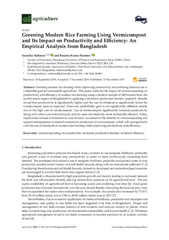 Greening modern rice farming using vermicompost and its impact on productivity and efficiency: an empirical analysis from Bangladesh.