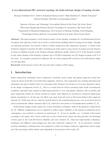 This paper proposes a novel one-port passive circuit topology consisting of a two-dimensional network of resistors and capacitors, which can be used as a fault-tolerant building block for analog circuit design. Through an analytical procedure, the network is shown to follow simple first-order admittance dynamics. A Monte Carlo method is employed to describe the effect of simultaneous faults (short or open circuit) in random network elements in terms of confidence bounds in the frequency-domain admittance profile. Faults in 10% of the elements resulted in only minor changes of the frequency response (up to 3.9 dB in magnitude and 12.5 ∘ in phase in 95% of the cases). An example is presented to illustrate the use of the proposed RC network in the faulttolerant design of a low-pass filter.