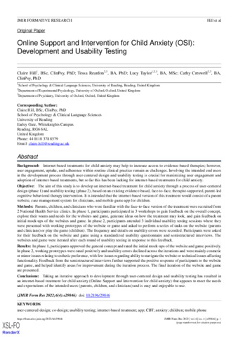 Online support and intervention for child anxiety (OSI): development and usability testing.