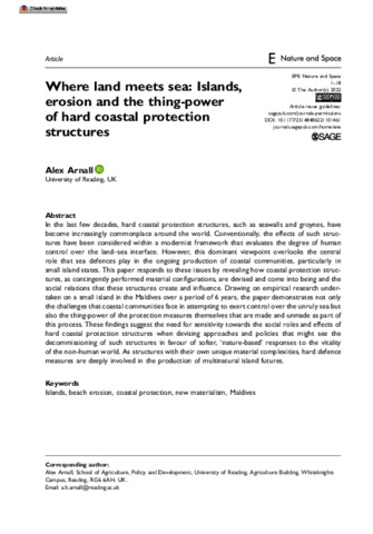 In the last few decades, hard coastal protection structures, such as seawalls and groynes, have become increasingly commonplace around the world. Conventionally, the effects of such structures have been considered within a modernist framework that evaluates the degree of human control over the land-sea interface. However, this dominant viewpoint overlooks the central role that sea defences play in the ongoing production of coastal communities, particularly in small island states. This paper responds to these issues by revealing how coastal protection structures, as contingently performed material configurations, are devised and come into being and the social relations that they create and influence. Drawing on empirical research undertaken on a small island in the Maldives over a period of six years, the paper demonstrates not only the challenges that coastal communities face in attempting to exert control over the unruly sea but also the thing-power of the protection measures themselves that are made and unmade as part of this process. These findings suggest the need for sensitivity towards the social roles and effects of hard coastal protection structures when devising approaches and policies that might see the decommissioning of such structures in favour of softer, ‘nature-based’ responses to the vitality of the nonhuman world. As structures with their own unique material complexities, hard defence measures are deeply involved in the production of multinatural island futures.
