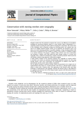 Yamazaki, H., Weller, H. orcid id iconORCID: https://orcid.org/0000-0003-4553-7082, Cotter, C. J. and Browne, P. A. orcid id iconORCID: https://orcid.org/0000-0001-9440-9517 (2022) Conservation with moving meshes over orography. Journal of Computational Physics, 461. 111217. ISSN 0021-9991 doi: 10.1016/j.jcp.2022.111217