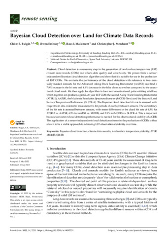 Bulgin, C. E. orcid id iconORCID: https://orcid.org/0000-0003-4368-7386, Embury, O. orcid id iconORCID: https://orcid.org/0000-0002-1661-7828, Maidment, R. I. orcid id iconORCID: https://orcid.org/0000-0003-2054-3259 and Merchant, C. J. orcid id iconORCID: https://orcid.org/0000-0003-4687-9850 (2022) Bayesian cloud detection over land for climate data records. Remote Sensing, 14 (9). 2231. ISSN 2072-4292 doi: 10.3390/rs14092231