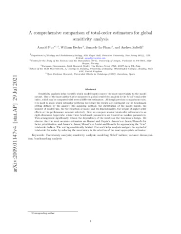 Puy, A., Becker, W., Lo Piano, S. orcid id iconORCID: https://orcid.org/0000-0002-2625-483X and Saltelli, A. (2022) A comprehensive comparison of total-order estimators for global sensitivity analysis. International Journal for Uncertainty Quantification, 12 (2). pp. 1-18. ISSN 2152-5080 doi: 10.1615/Int.J.UncertaintyQuantification.2021038133