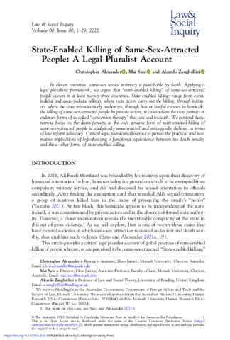 In eleven countries, same-sex sexual intimacy is punishable by death. Applying a legal pluralistic framework, we argue that ‘State-enabled killing’ of same-sex attracted people occurs in at least 23 countries. State-enabled killings range from extrajudicial and quasi-judicial killings, where State actors carry out the killing; through instances where the State retrospectively authorises, through bias or lawful excuses to homicide, the killing of same-sex attracted people by private actors; to cases where the State permits or endorses forms of so-called ‘conversion therapy’ that lead to death. We contend that a narrow focus on the death penalty as the only genuine form of State-enabled killing of same-sex attracted people is analytically unwarranted and strategically dubious in terms of law reform advocacy. Critical legal pluralism allows us to pursue the practical and normative implications of hypothesising a functional equivalence between the death penalty and these other forms of State-enabled killing.