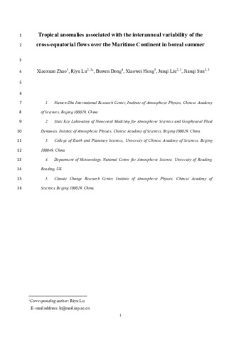 | Additional Information | Zhao, X., R. Lu, B. Dong,X. Hong, J. Liu, J. Sun, 2022: Tropical anomalies associated with the interannual variability of the cross-equatorial flows over the Maritime Continent in boreal summer. J. of Climate. https://doi.org/10.1175/JCLI-D-21- 0641.1 |
