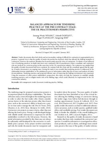 Whang, S.-W., Donyavi, S., Flanagan, R. and Kim, S. (2022) Balanced approach for tendering practice at the pre-contract stage: the UK practitioner's perspective. Journal of Civil Engineering and Management, 28 (5). pp. 338-348. ISSN 1822-3605 doi: 10.3846/jcem.2022.16580