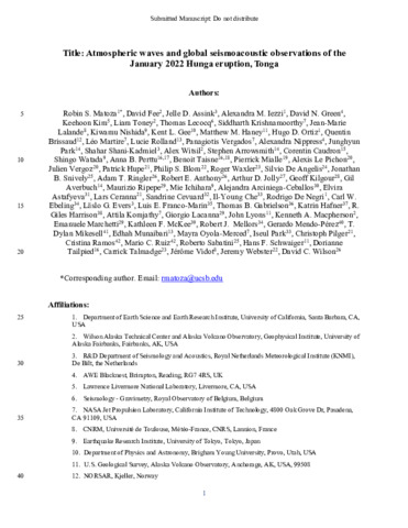 Matoza, R. S., Fee, D. orcid id iconORCID: https://orcid.org/0000-0003-0693-347X, Assink, J. D., Iezzi, A. M., Green, D. N., Kim, K., Toney, L., Lecocq, T., Krishnamoorthy, S., Lalande, J.-M., Nishida, K., Gee, K. L., Haney, M. M., Ortiz, H. D., Brissaud, Q., Martire, L., Rolland, L., Vergados, P., Nippress, A., Park, J., Shani-Kadmiel, S., Witsil, A., Arrowsmith, S., Caudron, C., Watada, S., Perttu, A. B., Taisne, B., Mialle, P., Le Pichon, A., Vergoz, J., Hupe, P., Blom, P. S., Waxler, R., De Angelis, S., Snively, J. B., Ringler, A. T., Anthony, R. E., Jolly, A. D., Kilgour, G., Averbuch, G., Ripepe, M., Ichihara, M., Arciniega-Ceballos, A., Astafyeva, E., Ceranna, L., Cevuard, S., Che, I.-Y., De Negri, R., Ebeling, C. W., Evers, L. G., Franco-Marin, L. E., Gabrielson, T. B., Hafner, K., Harrison, R. G. orcid id iconORCID: https://orcid.org/0000-0003-0693-347X, Komjathy, A., Lacanna, G., Lyons, J., Macpherson, K. A., Marchetti, E., McKee, K. F., Mellors, R. J., Mendo-Pérez, G., Mikesell, T. D., Munaibari, E., Oyola-Merced, M., Park, I., Pilger, C., Ramos, C., Ruiz, M. C., Sabatini, R., Schwaiger, H. F., Tailpied, D., Talmadge, C., Vidot, J., Webster, J. and Wilson, D. C. (2022) Atmospheric waves and global seismoacoustic observations of the January 2022 Hunga eruption, Tonga. Science, 377 (6601). pp. 95-100. ISSN 1095-9203 doi: 10.1126/science.abo7063