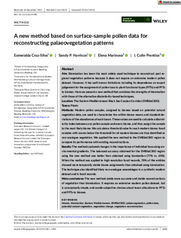 Aim: Biomisation has been the most widely used technique to reconstruct past regional vegetation patterns because it does not require an extensive modern pollen dataset. However, it has well-known limitations including its dependence on expert judgement for the assignment of pollen taxa to plant functional types (PFTs) and PFTs to biomes. Here we present a new method that combines the strengths of biomisation with those of the alternative dissimilarity-based techniques. Location: The Eastern Mediterranean-Black Sea Caspian Corridor (EMBSeCBIO) region, 28°–49°N, 20°–62°E. Methods: Modern pollen samples, assigned to biomes based on potential natural vegetation data, are used to characterize the within-biome means and standard deviations of the abundances of each taxon. These values are used to calculate a dissimilarity index between any pollen sample and every biome, and thus assign the sample to the most likely biome. We calculate a threshold value for each modern biome; fossil samples with scores below the threshold for all modern biomes are thus identified as non-analogue vegetation. We applied the new method to the EMBSeCBIO region to compare its performance with existing reconstructions. Results: The method captured changes in the importance of individual taxa along environmental gradients. The balanced accuracy obtained for the EMBSeCBIO region using the new method was better than obtained using biomisation (77% vs. 65%). When the method was applied to high-resolution fossil records, 70% of the entities showed more temporally stable biome assignments than obtained using biomisation. The technique also identified likely non-analogue assemblages in a synthetic modern dataset and in fossil records. Main conclusions: The new method yields more accurate and stable reconstructions of vegetation than biomisation. It requires an extensive modern pollen dataset, but is conceptually simple, and avoids subjective choices about taxon allocations to PFTs and PFTs to biomes.
