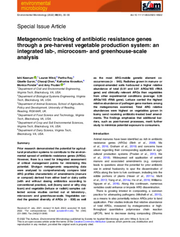 Metagenomic tracking of antibiotic resistance genes through a pre‐harvest vegetable production system: an integrated lab‐, microcosm‐ and greenhouse‐scale analysis.